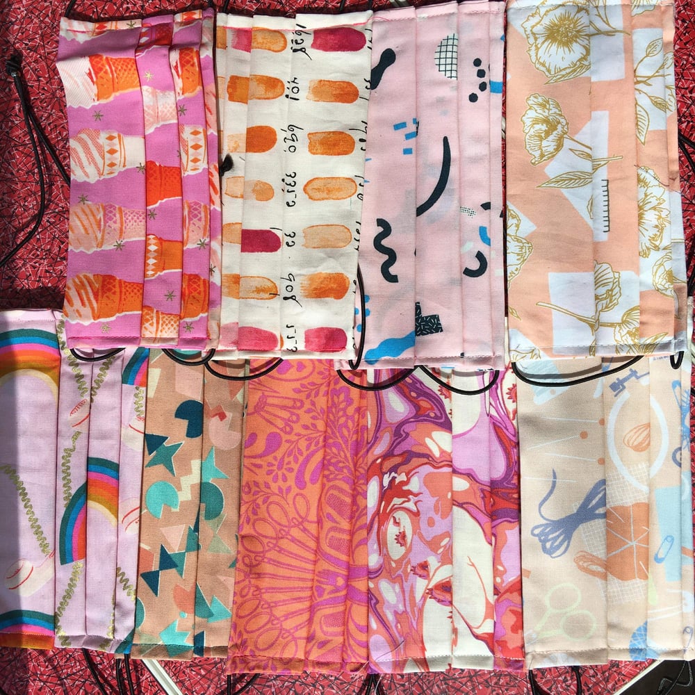 Hand made face coverings using 100% cotton that's got a close weave so it's breathable but effective. They have cord elastic ties with a bead on so they're adjustable. Pleated design. There's a pocket at the back for a filter if wanted, wear the mask pocket side towards your face.